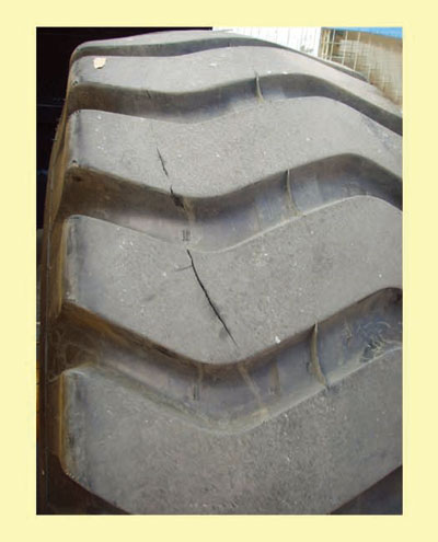 原因:行驶于砂石路面,轮胎打滑,胎面胶被尖锐物整齐划开。